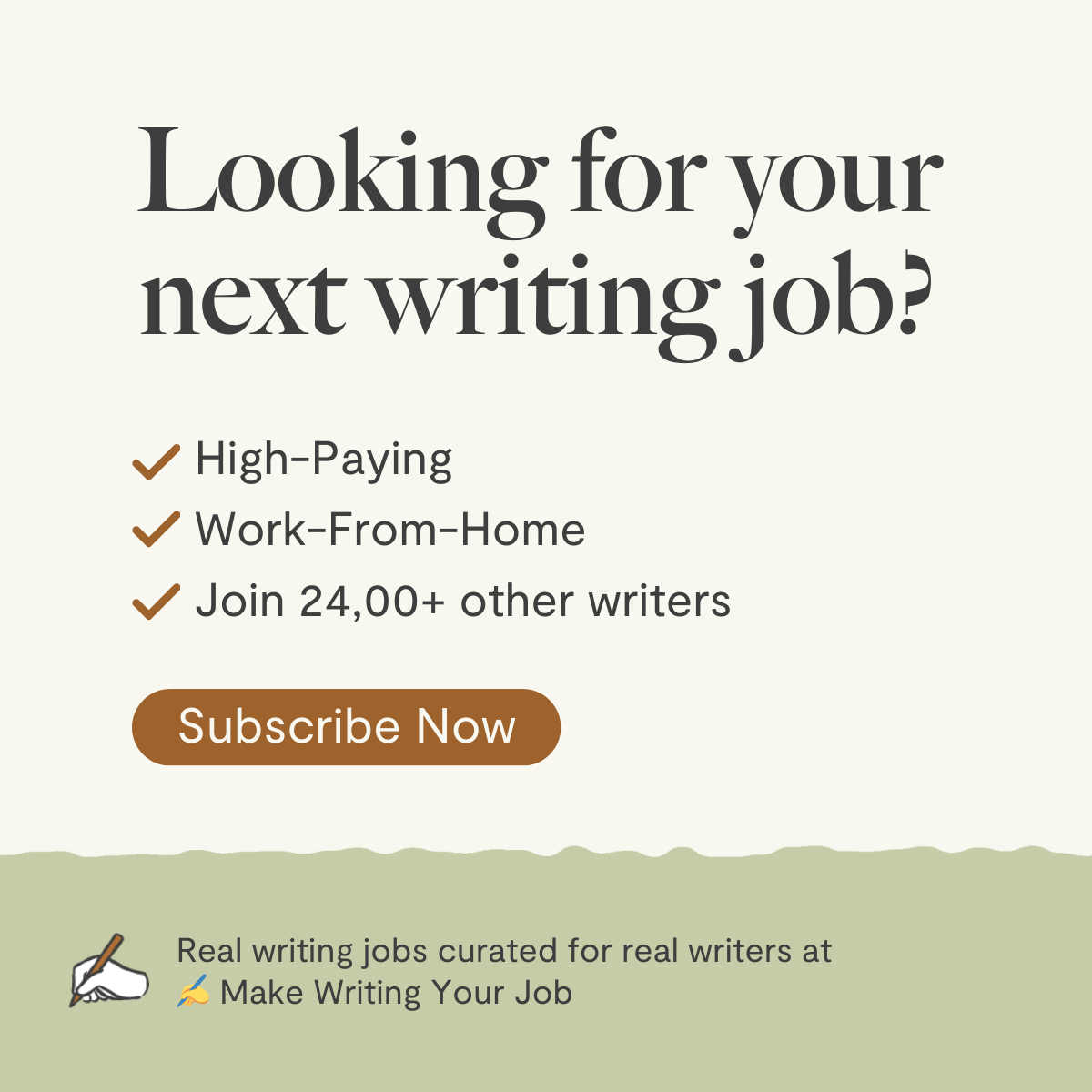 Subscribe to my newsletter ✍️ MAKE WRITING YOUR JOB to join thousands of writers getting high-paying writing jobs, creative leads, and live Zoom classes. ✨ New jobs 2x/week, and posted 6 days/week on our subscriber chat. Real writers are landing real work—don’t miss out.